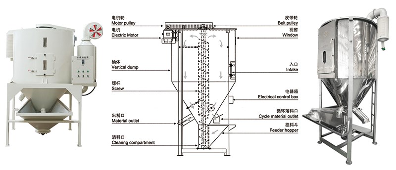 2、適用于各種塑料與色母粒的混合干燥攪拌,新、舊料及色母粒干燥混合則效果更佳。